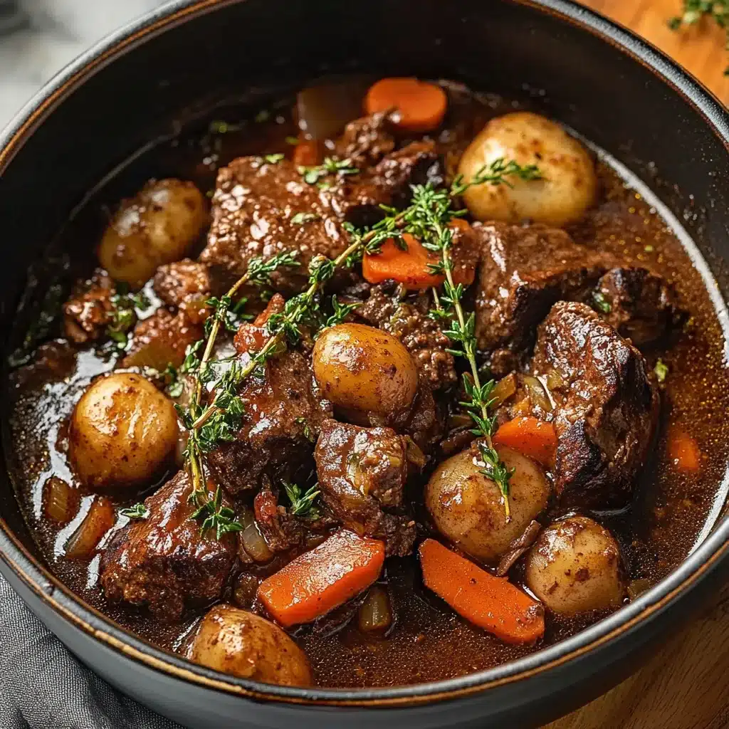 6. Combine Ingredients: Return the beef to the pot. Add the marinade (red wine), beef broth, tomato paste, thyme, and bay leaves. Bring to a simmer.