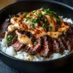 - Assemble the Bowls: Fluff the cooked rice and divide it between bowls. Top with sliced steak and stir-fried vegetables. Drizzle the spicy cream sauce generously over the top.