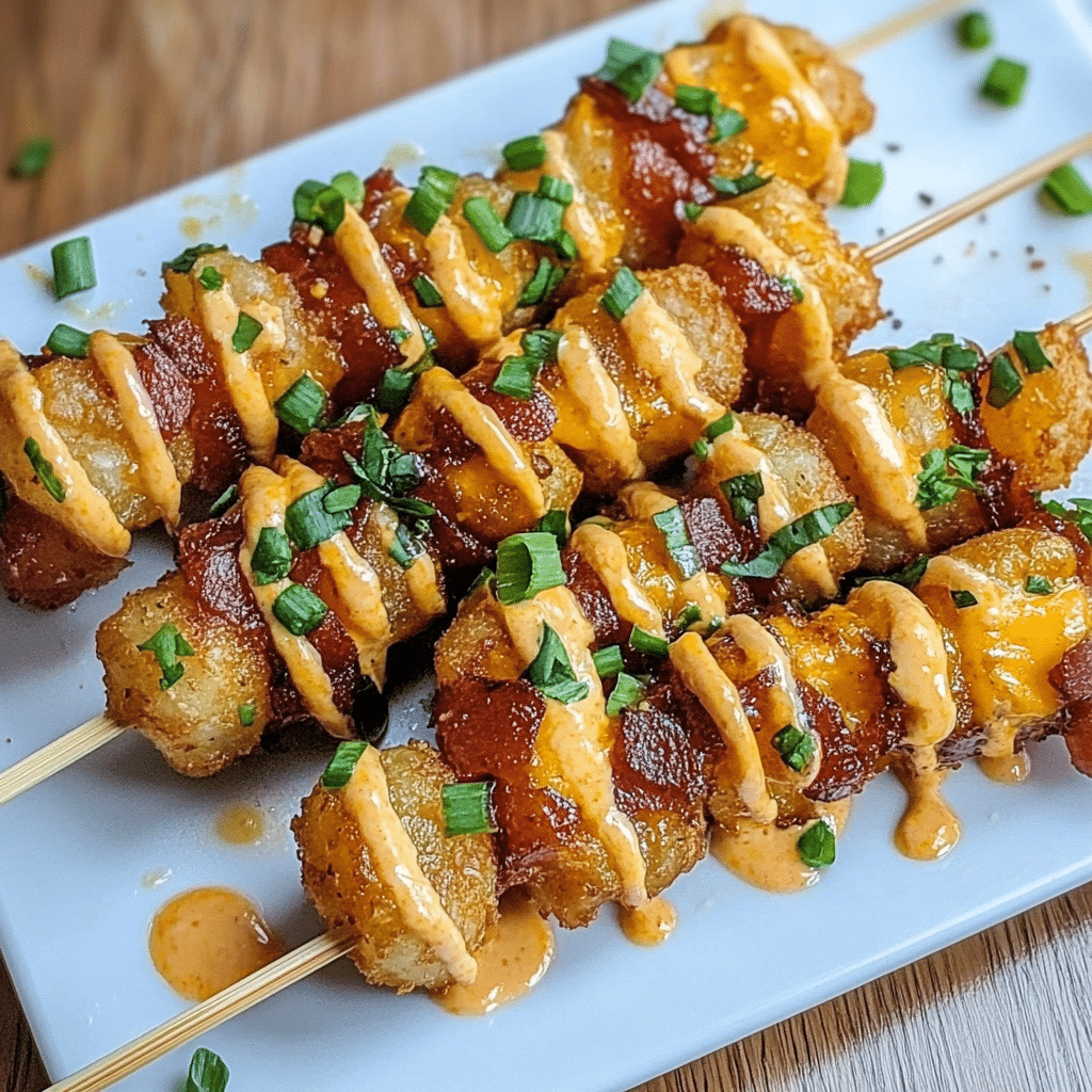 Loaded Tater Tot Skewers are a fun and delicious twist on a classic favorite, perfect for appetizers, game day snacks, or a satisfying treat. Stack crispy tater tots with melted cheese, crispy bacon, and flavorful toppings to create an irresistible bite-sized delight.