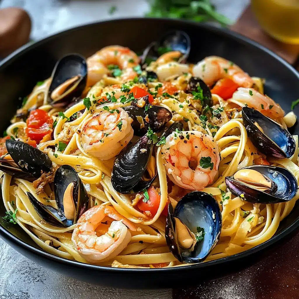 Follow these easy steps to create your Seafood Pasta with Linguine, Shrimp, and Mussels: